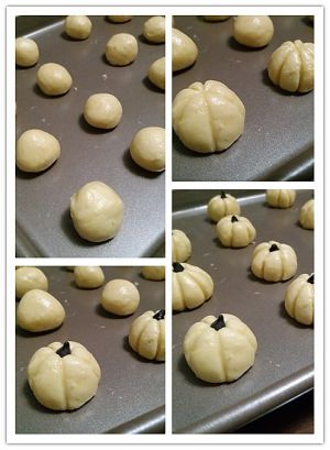 取均匀的面团揉圆,之后用水果刀或者刮板按成南瓜形状,顶部加上葡萄干做蒂。