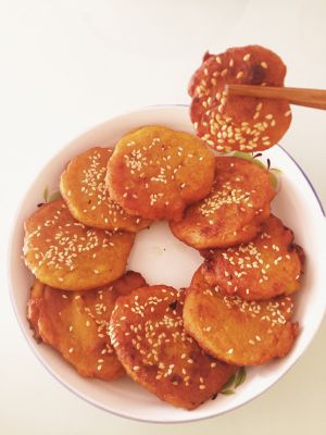 放锅里小火慢慢煎炸,记得不时两边翻,待两面金黄酥脆撒上些许芝麻就完成了