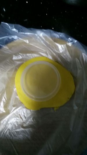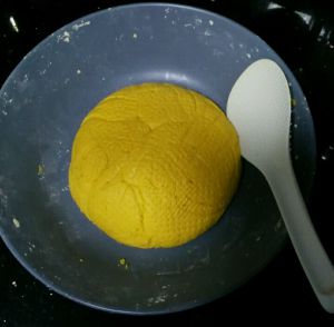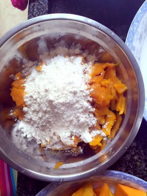 南瓜蒸熟,倒掉碟中水,用饭勺压烂成泥,加入少量面粉,适量炼乳,糯米粉,一次性不要加太多糯米粉,用手和面,再续加糯米粉,直至手,碟与面团可随意分离,不再有沾联。面团放置10分钟。
