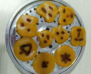 碟底抹一层花生油,以防饼底沾连。用枸杞子点缀,隔水蒸熟。