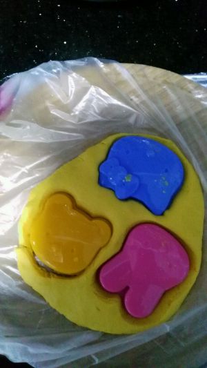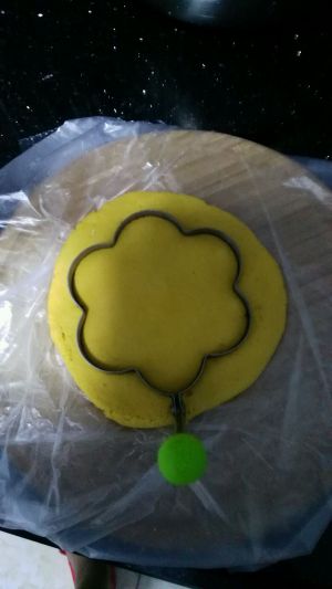 将面团分小块,用双手掌心搓圆,压扁,用圆形盖切圆状南瓜饼。