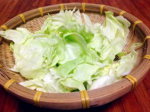 先将包菜径部放入大火翻炒,炒软后再放入叶子部分一起翻炒