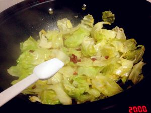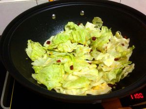 把包菜放进去快速翻炒,不断翻炒炒至回软