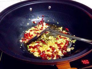 锅内烧热油,爆香辣椒、葱、姜大蒜