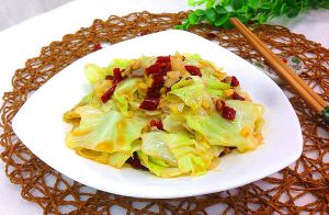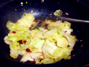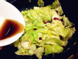 倒入包菜继续翻炒,加盐加鸡精加点醋,继续翻炒熟了即可。