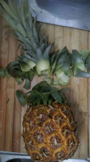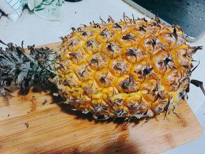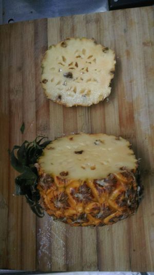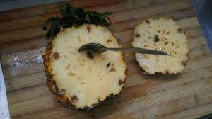 买了一个菠萝,然后让水果师傅帮忙切开,大家可以看到那个切口,回家用盐水稍微浸泡几分钟
