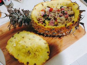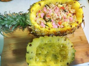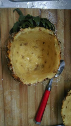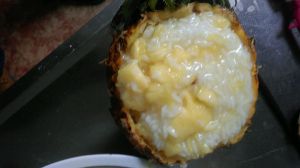 将米饭盛到菠萝里,可以直接吃了。不过我又在烤箱里烤了七八分钟。等菠萝的香味出来时,就可以开动了!味道很不多哦!