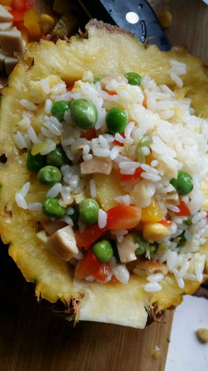 像炒饭一样,先倒油,然后再炒菜,最后放米饭,菠萝。我把掏菠萝时出来的汁都倒进去了。然后到点生抽,鸡精,出锅啦!食材均没有量化,中餐嘛,就是随心所欲啦!