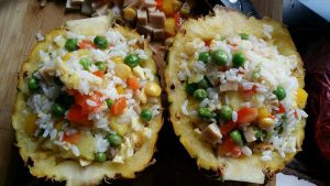 将伴好的菠萝饭放在菠萝里,用刚刚的半个菠萝封上口,入蒸锅蒸20分钟!