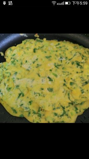 锅加热后倒入少许油加入少量蔬菜蛋液煎到表面蛋液凝固即可(我烙了三个饼)