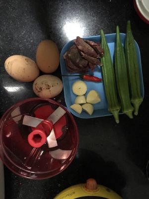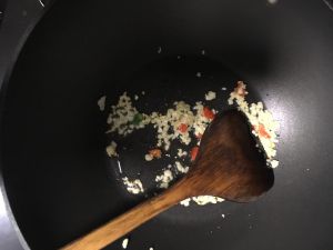 锅加热后放入少许油先放入蒜和小米椒炒出香味后倒入切好的秋葵、牛肉,翻炒几下后盛出备用。