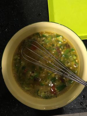 首先吧蔬菜切成末,让后放一碗面分加点盐加两个鸡蛋加水搅拌,用筷子搅拌不能太干,也不能太xi了