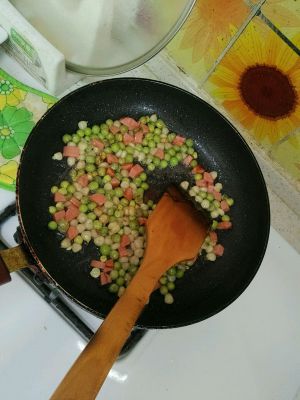 提前把冷冻的蔬菜粒拿出来解冻,炒锅热油,放入蔬菜粒翻炒