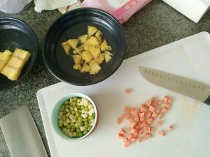 青豌豆,玉米煮熟,火腿切丁。菠萝切好泡纯净水里。没有加盐因为我吃了熟透了甜味可以。