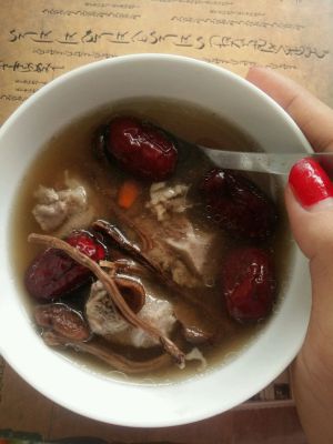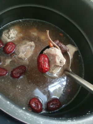 茶树菇提前半小时泡发好,排骨加水入锅煮开,放入茶树菇、红枣、枸杞