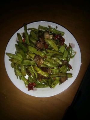 将炸好的芸豆捞出锅,将锅里多余的油舀出来,留点油放入猪肉片,稍微卤一卤猪肉,再加入辣椒蒜末,爆炒辣椒,蒜末,爆出香味之后加入炸好的芸豆加入盐,花椒面,少许酱油,翻炒均匀使调料和芸豆充分混合,即可出锅。看起来是不是很好吃啊?