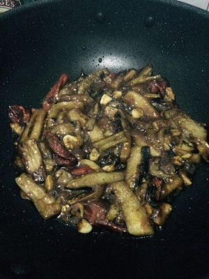 锅里再放少许油即可,炒入大蒜生姜,出香味时放入豆瓣酱炒热后倒入茄子和辣椒,翻炒后放入刚才调好的汁,待水收干即可出锅。