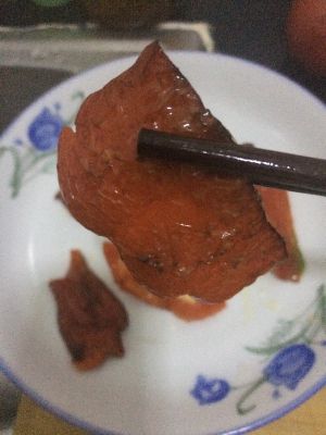 茄子进去翻炒,翻炒一会焖锅盖,途中打开翻炒下,看茄子扁了,大概熟了,放生抽一勺半、料酒一勺半、老抽半勺(着色)、糖一勺不到。