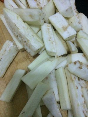 茄子去皮切成1.5cm粗的条,豇豆切成长5cm长段