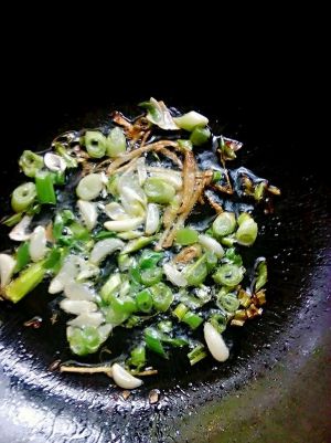 2、锅内倒入油烧热,将切好的葱花、姜丝、蒜放入锅内爆香