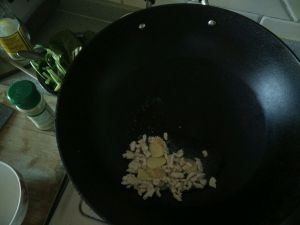 跟着炒鸡肉,可以不用洗锅(懒得洗哈哈)。加点点油,不要多↣下姜丝↣鸡肉(因为料酒的味道太重,所以我洗了一遍清水洗掉味道)↣大火炒~