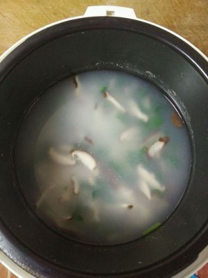 大米洗净浸泡三十分钟(米和水的比例是半碗米三碗水)然后电饭锅煮至开锅,倒入提前备好的香菇菠菜鸡肉,放入一小勺盐,一小勺白胡椒粉,按下煮饭键,开锅即可。