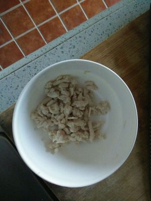 (上个步骤忘记拍了,大家见谅╭(╯ε╰)╮),其实就是鸡胸肉切成小粒(鸡胸肉的量看个人喜好添加)然后放入小半勺盐和淀粉,适量姜片,一小勺料酒拌匀,腌制十分钟备用。