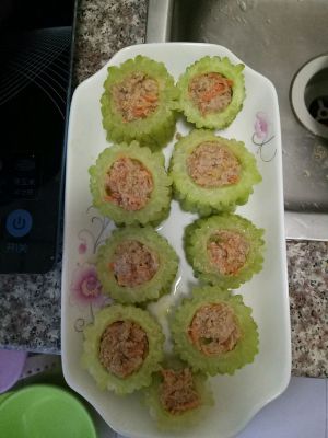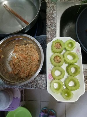 瘦肉加点胡萝卜,葱段,淀粉,调味品调好馅料,放入苦瓜内
