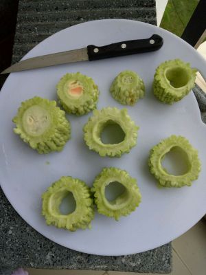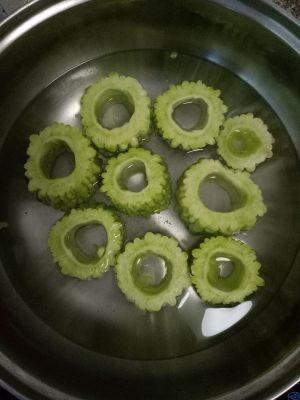 把苦瓜洗净切成1厘米厚,掏空中间的肉和白膜.