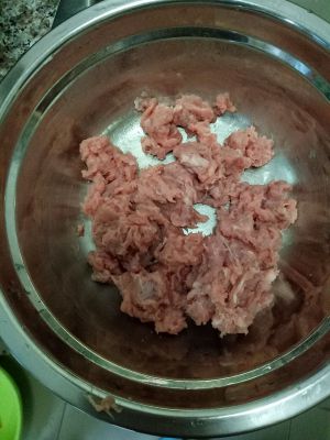 加入少许清水,将肉馅顺一个方向搅打上劲备用。