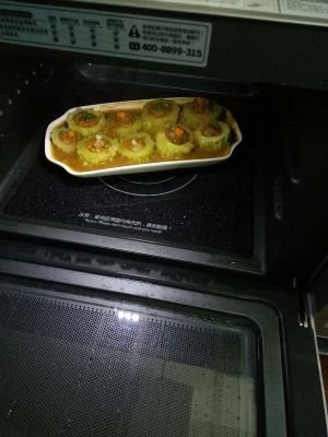 把肉馅放到苦瓜圈里,为了再煎制过程中肉馅不会缩小掉下去,在放肉馅时略大于窟窿的大小,要多一些平铺在苦瓜的侧边, 4、平底锅放少量油,小火煎十分钟,等定型后,放烤箱上下火200度烤10分钟就可以开吃啦。
