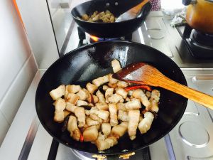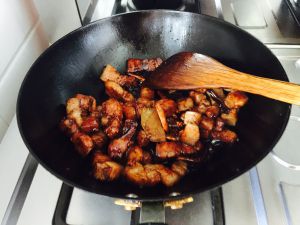 锅里放少许油,放冰糖炒糖色。注意火不要太大,不然容易焦,焦了会苦。有点冒大泡的时候下五花肉,翻炒让它上色均匀。