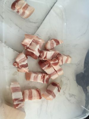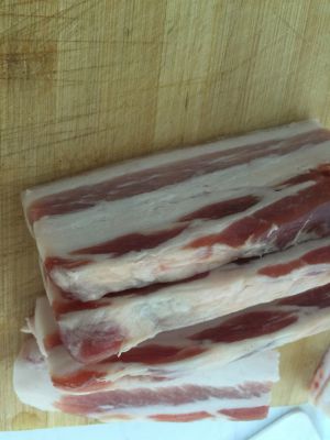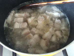 (爱森的五花肉肥瘦相间,好漂亮)洗净五花肉放锅里煮一下再冲洗干净,切块。