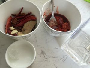 备料:红方两块、冰糖一块、辣椒、八角、姜蒜、香叶