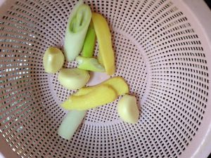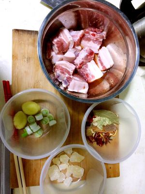 热锅温油,小火加入姜片煸香,改中火,倒入肉和排骨翻炒,表面微微有点焦的时候喷入料酒 翻炒后,加入半勺生抽、半勺蒸鱼豉油、少许老抽、白糖、小葱,倒入少许啤酒,翻炒后改最最小的文火,炖60分钟。切记中途一点要用锅铲翻炒几次,以免糊锅。