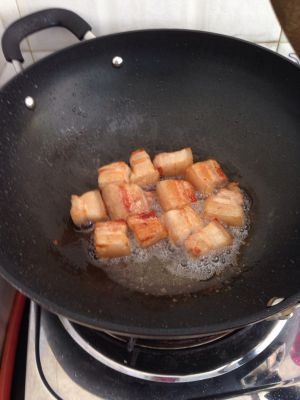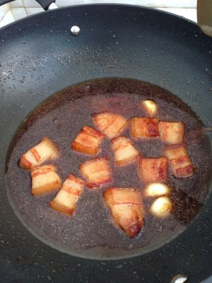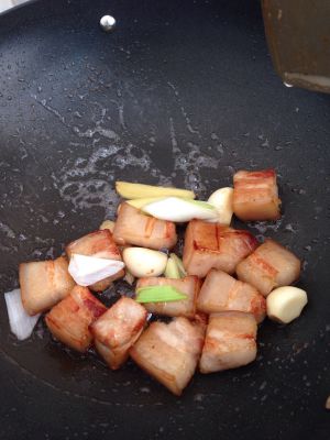 开大火,放入五花肉,炒到变成金黄色,放入葱姜,桂皮,倒入酱油(想让菜的颜色深些,多放酱油,盐就可不放)