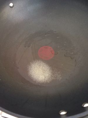 锅内放入少许油,烧到6成热,放入白糖,顺时针搅拌,将白糖融化。