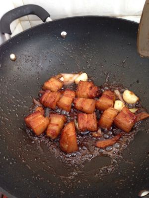 油锅烧热,下入冰糖转小火至冰糖全部融化(冰糖溶化会变色哦并不是糊了),下入肉块翻炒至表面轻微上色,盛出。油锅倒入葱姜及香料翻炒出香味,下肉,加入2:1的老抽和生抽,少量蚝油(也可不放),倒入开水没过肉,水开转小火慢炖一小时。