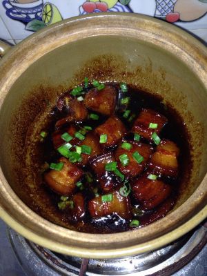 炖至沙变浓稠就行,撤点葱花,香喷喷的五花肉出锅啦!