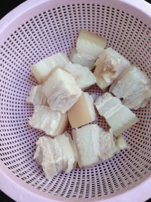 材料备齐。用料酒将切好的五花肉腌制十五分钟。然后将五花肉冷水下锅直至水开肉变色,撇去浮沫(不可烧的时间过长,肉易老)捞出肉。
