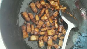 锅中余少许油,倒入五花肉小火煸炒,直到肉微焦黄起锅