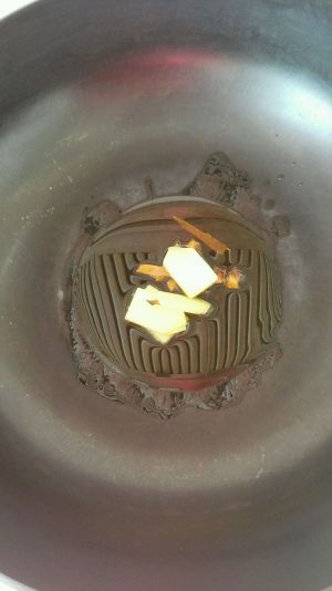 姜切片,八角一个掰开,桂皮掰开,锅热油,下姜片、八角、桂皮炒香起锅