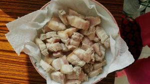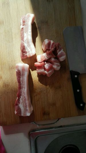 五花肉切麻将块大小,为了更好的入味我后来改成麻将的一半大小
