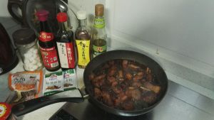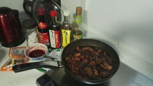 加红烧酱油,方糖(家里冰糖用完了),加水,淹没五花肉,再加入鸡汁