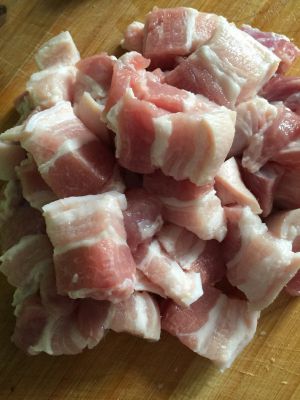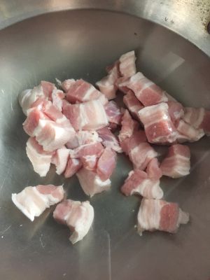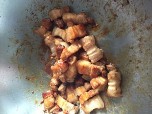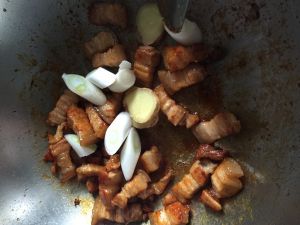 倒入五花肉排骨煎炒出猪肉本来多于的油,直到肉有些上色