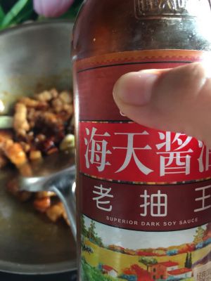 起锅烧油,放入冰糖小火炒化,放五花肉炒糖色。加入两大勺料酒(去腥),一大勺老抽,一勺生抽,一点白糖(提鲜),翻炒片刻。