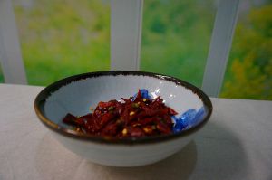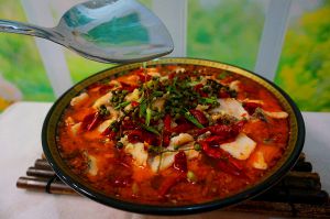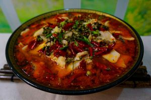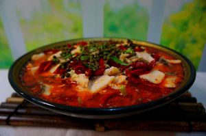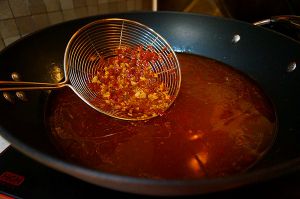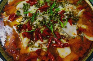 煮鱼片同时另起一锅将油烧热,投入干红椒节和青花椒炸香