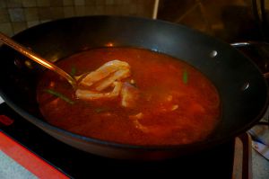 油锅起,放入葱姜蒜爆香,加豆瓣酱炒出红油,倒入适量开水,汤煮沸后,一手带上一次性手套,取适量鱼虾滑在手的虎口间,挤成丸子入汤;