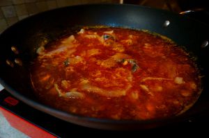 加水,火锅底料,熬制一会儿,加入杏鲍菇,豆皮,放入鱼。大火炖20分钟。大火收汁。
