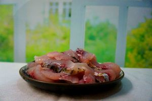 斜刀30°左右片成2至3mm左右厚的鱼片,尽量大小厚薄一致,以保证能同时成熟。